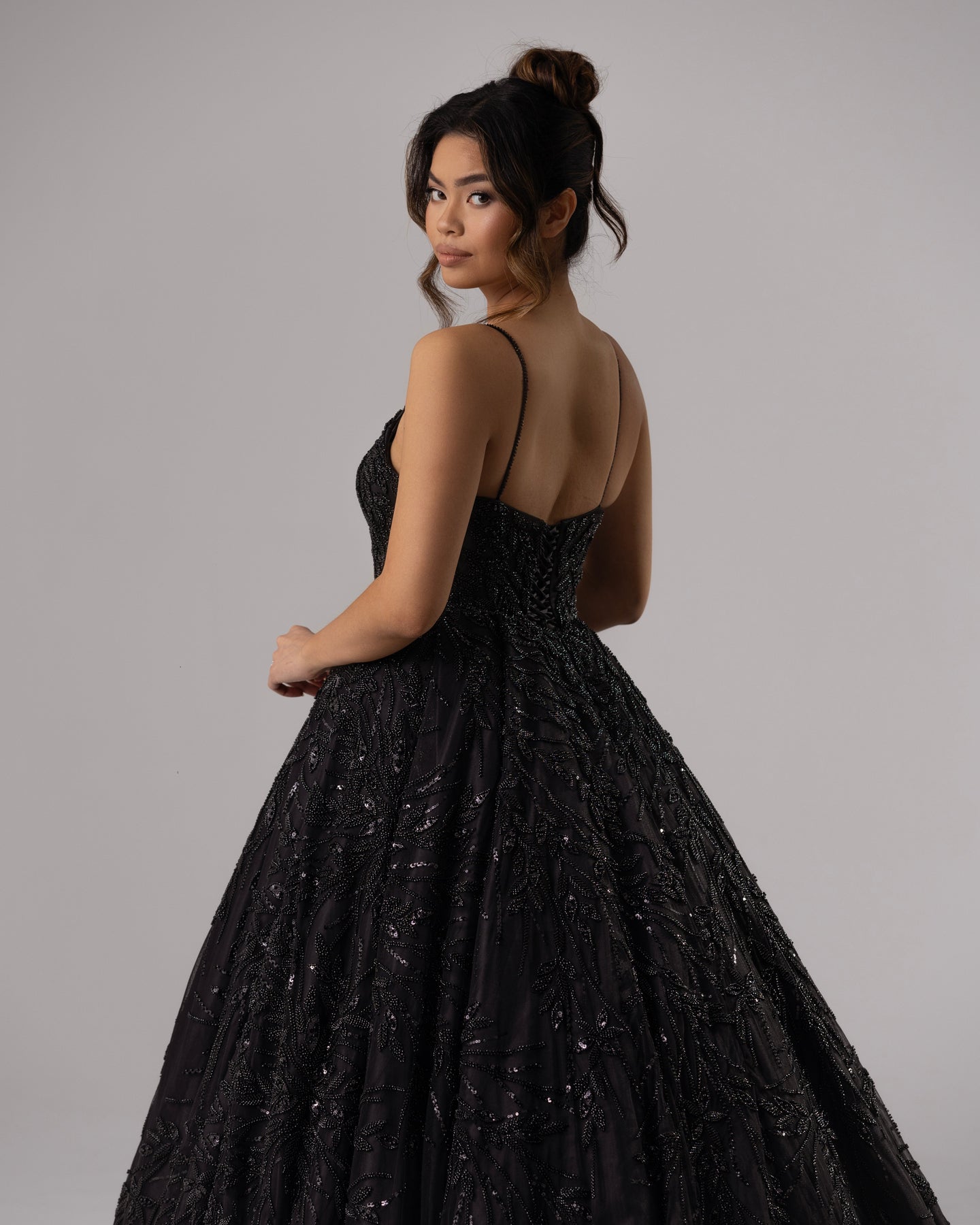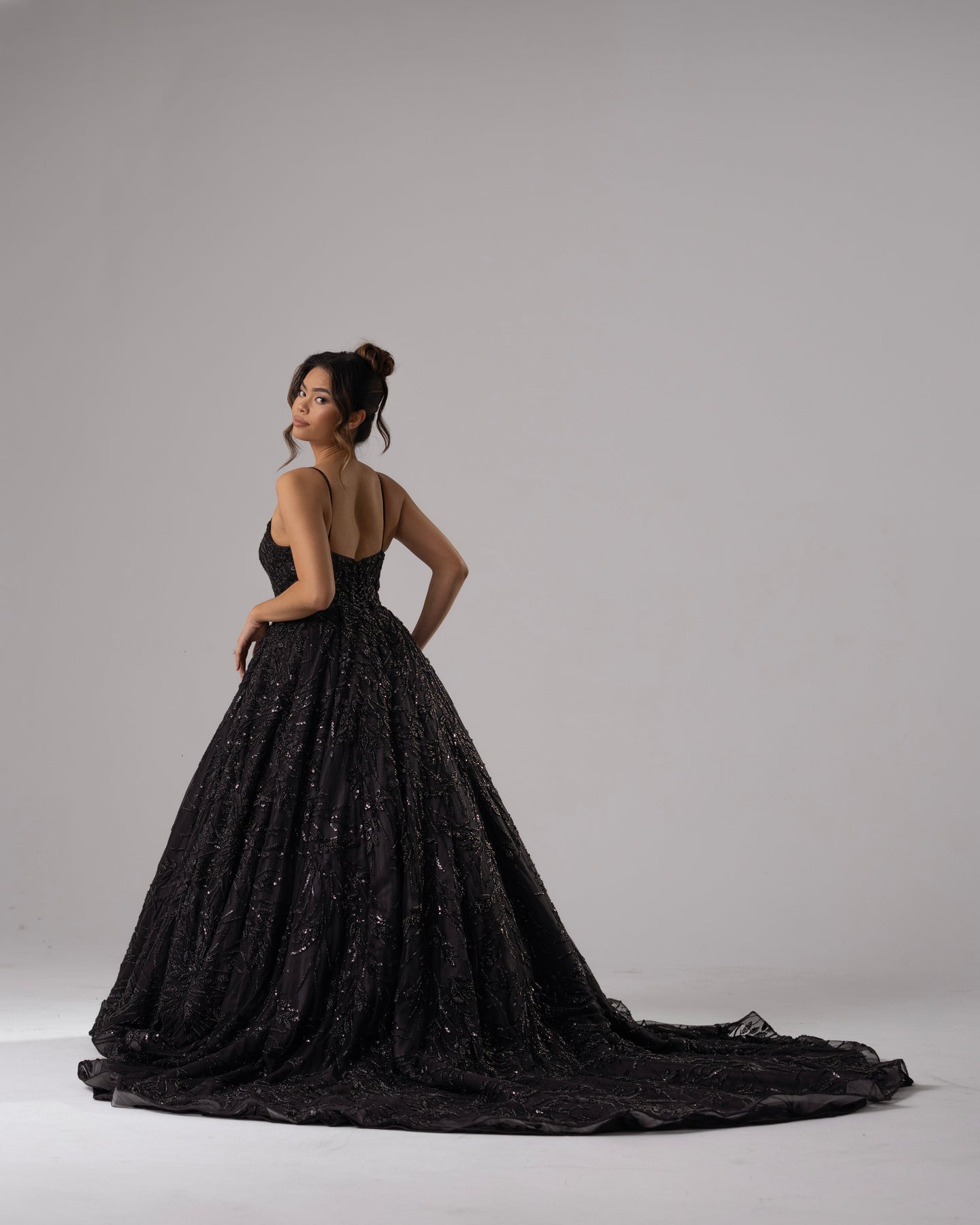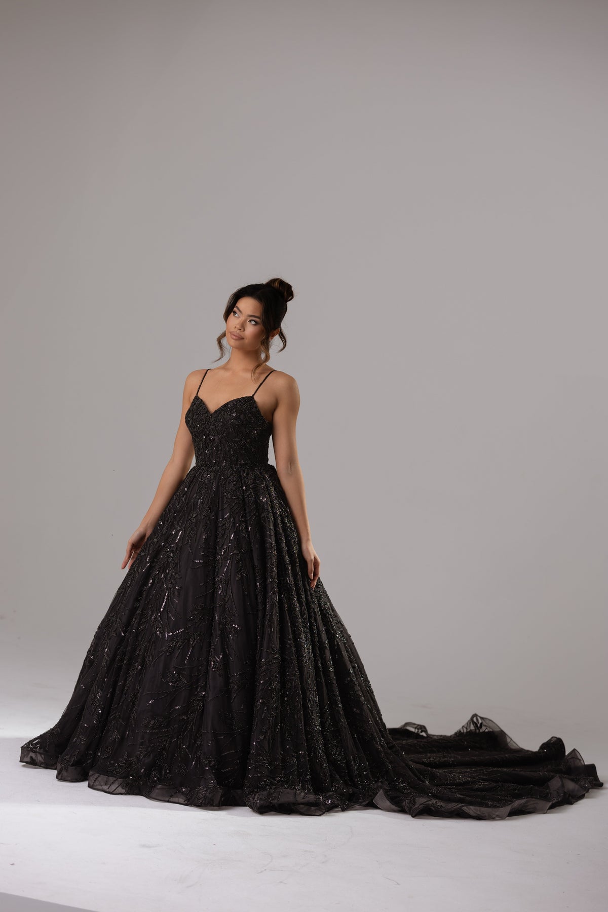 Indulge in the opulence of Persephone, a timeless black ballgown adorned with intricate full lace embellishment and hand-beaded crystals. The sweetheart neckline and spaghetti beaded straps elevate this dress to a new level of elegance. Perfect for any formal occasion, this gown is a must-have for the sophisticated and exclusive.