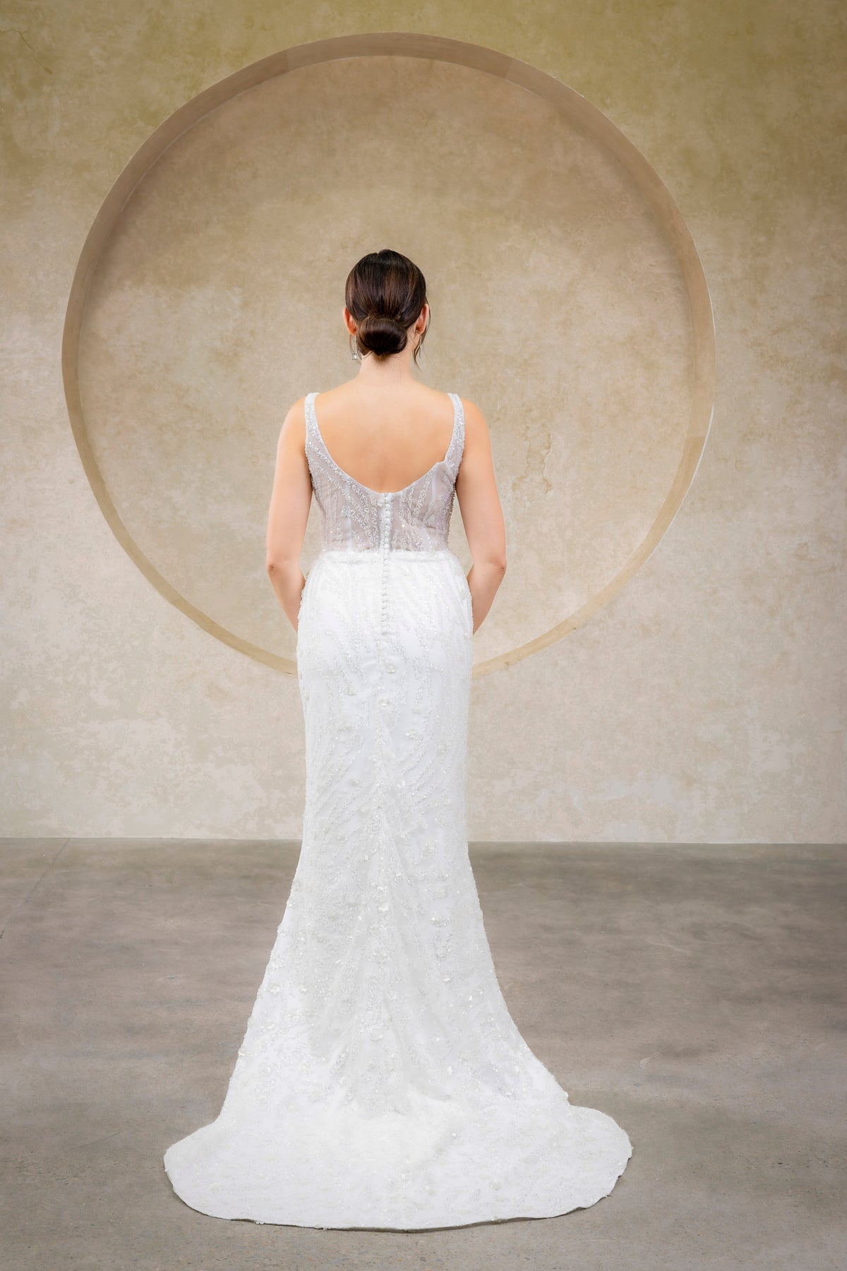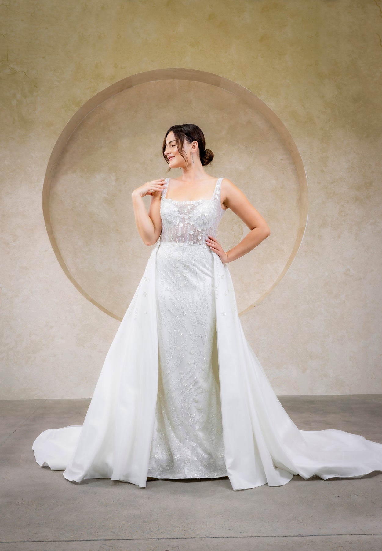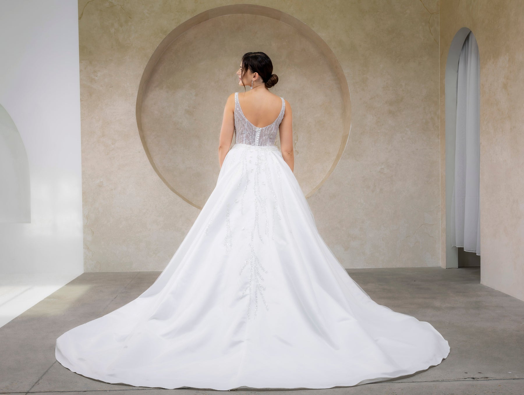 Rebecca is a stunning dress that will make you feel like a princess on your special day. The beautiful lace and scoop neckline add a touch of elegance, while the detachable skirt allows for versatility in your look. The detachable train with a long train adds a dramatic flair, and the zipper back and button details provide a secure and comfortable fit. Make a statement with Rebecca.