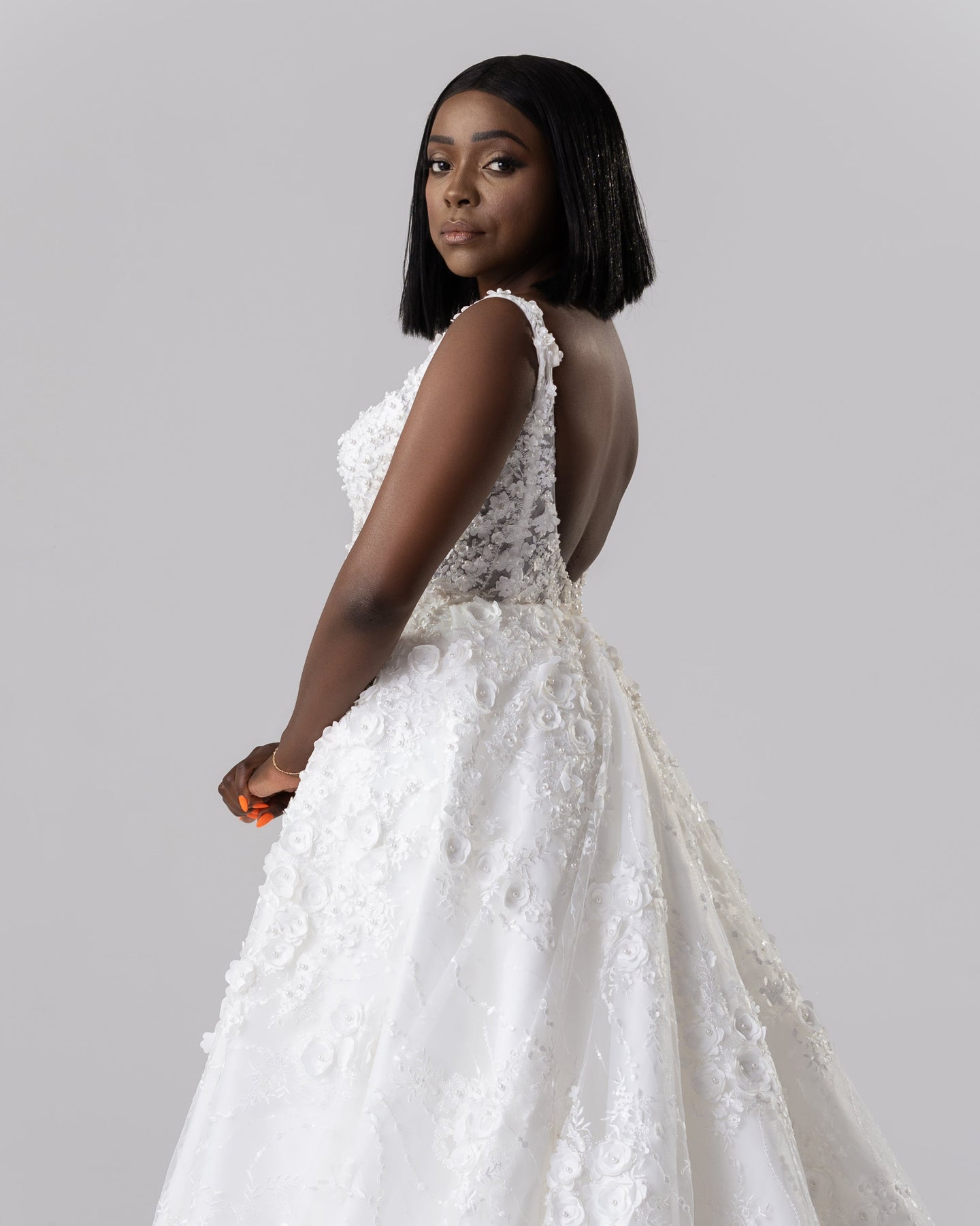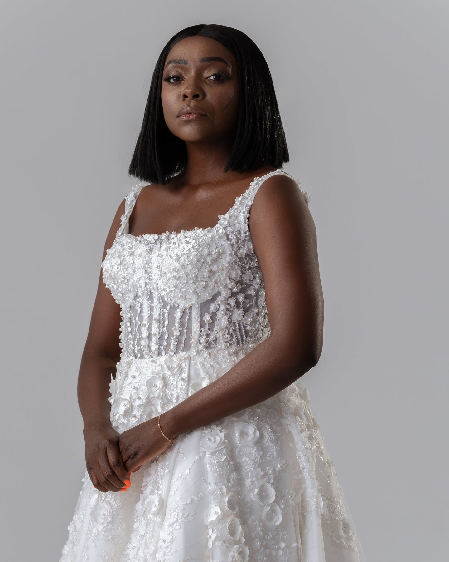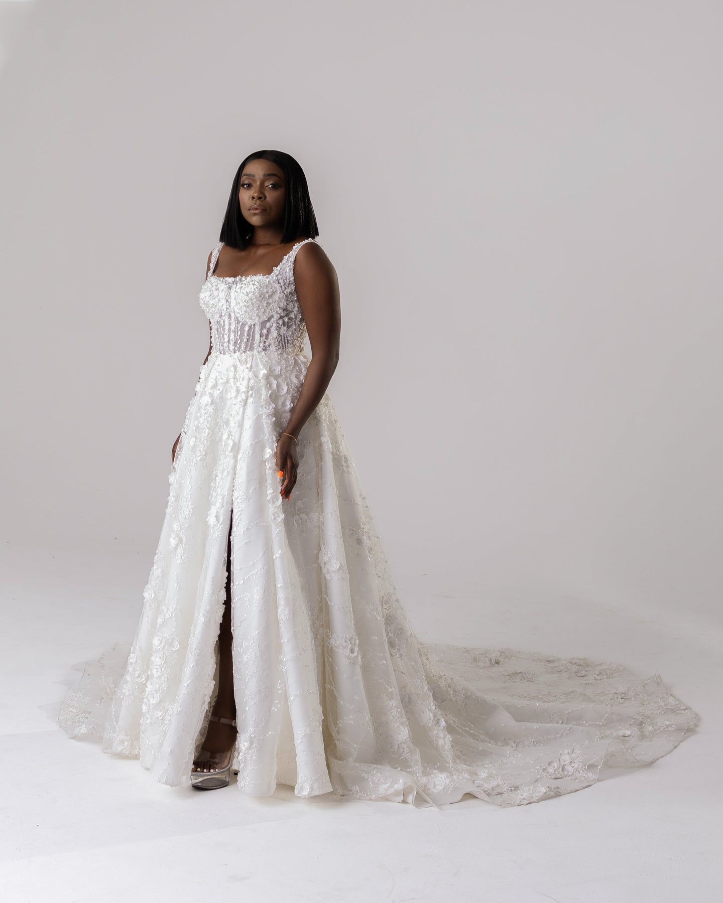 Experience luxury with Hiba's satin A-line dress. The square neckline and laced straps exude elegance, while the sexy split and long train add allure. Elevate your style with this exclusive piece. A perfect blend of sophistication and sensuality.