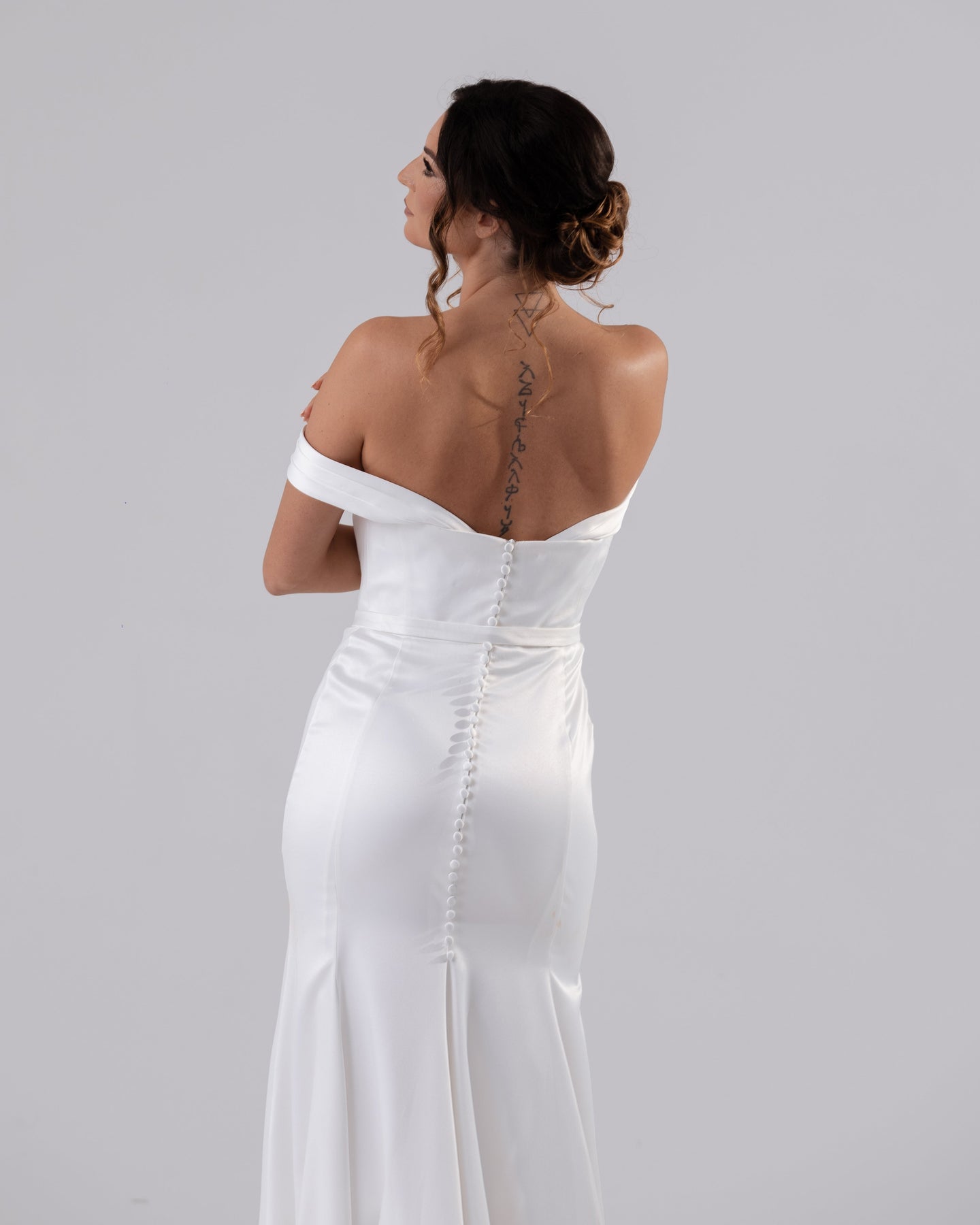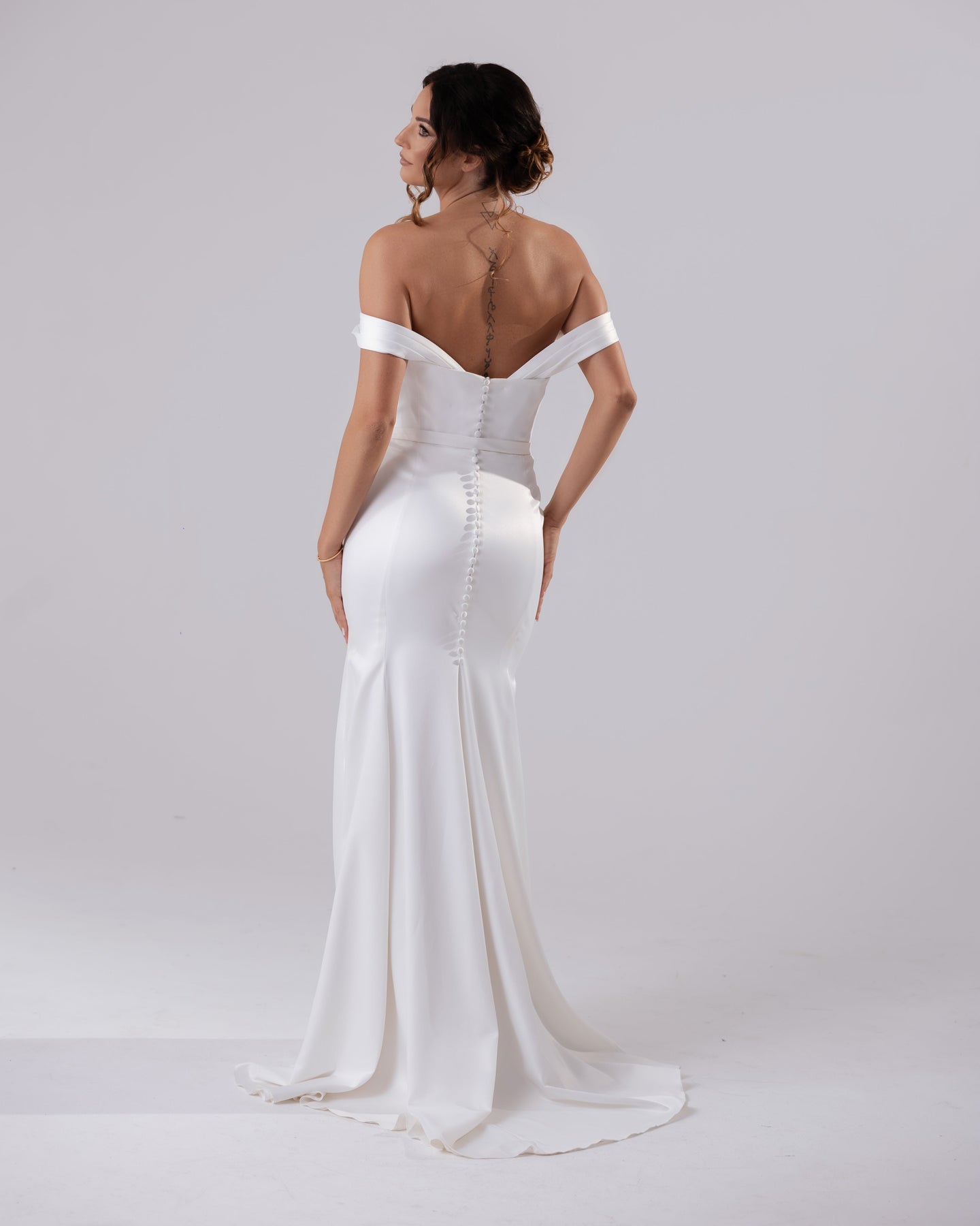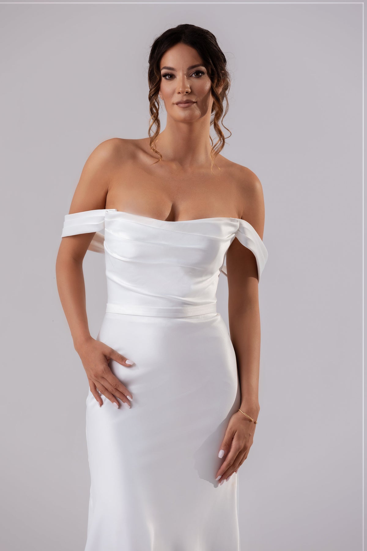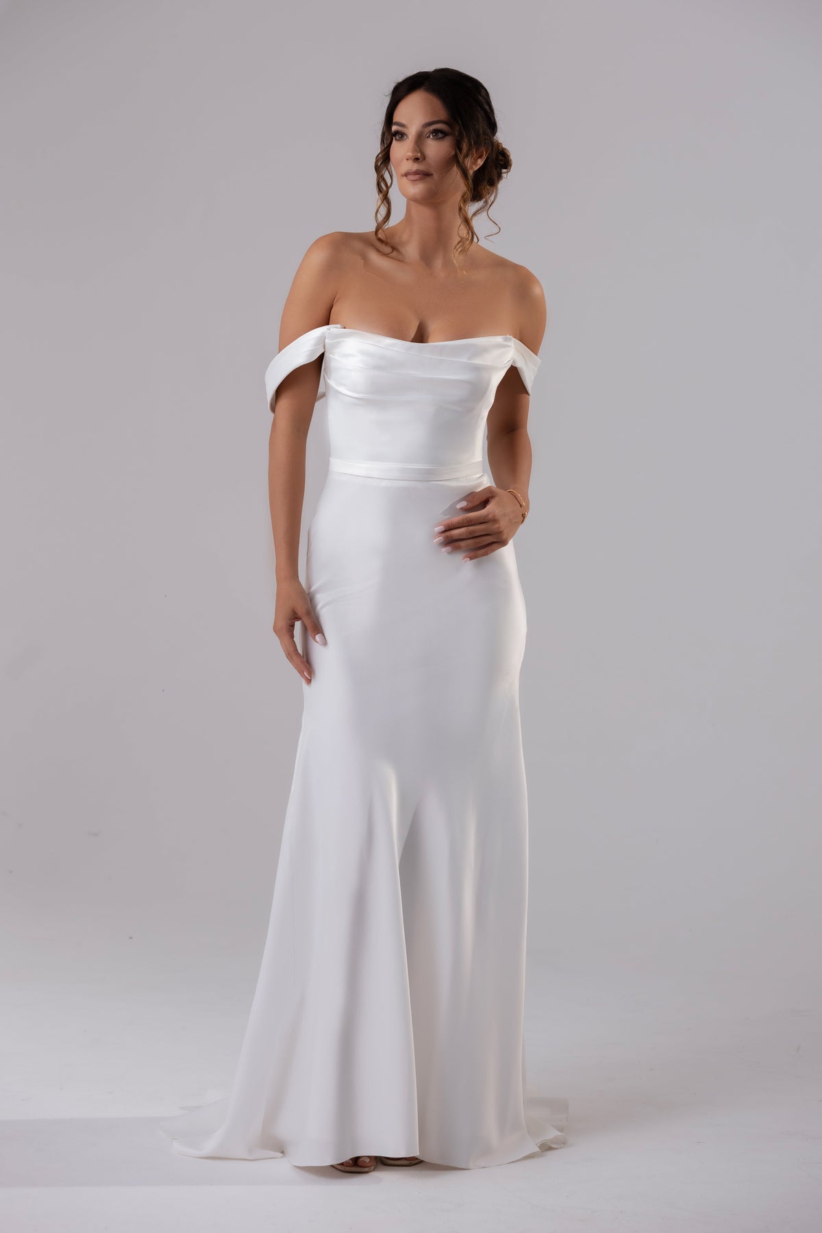 Elevate your style with Penny, a modern fit and flare dress featuring an off the shoulder design and detachable cap sleeves. The V back adds a sexy touch to this elegant satin piece. Providing a sophisticated and exclusive look, Penny is perfect for any upscale event.