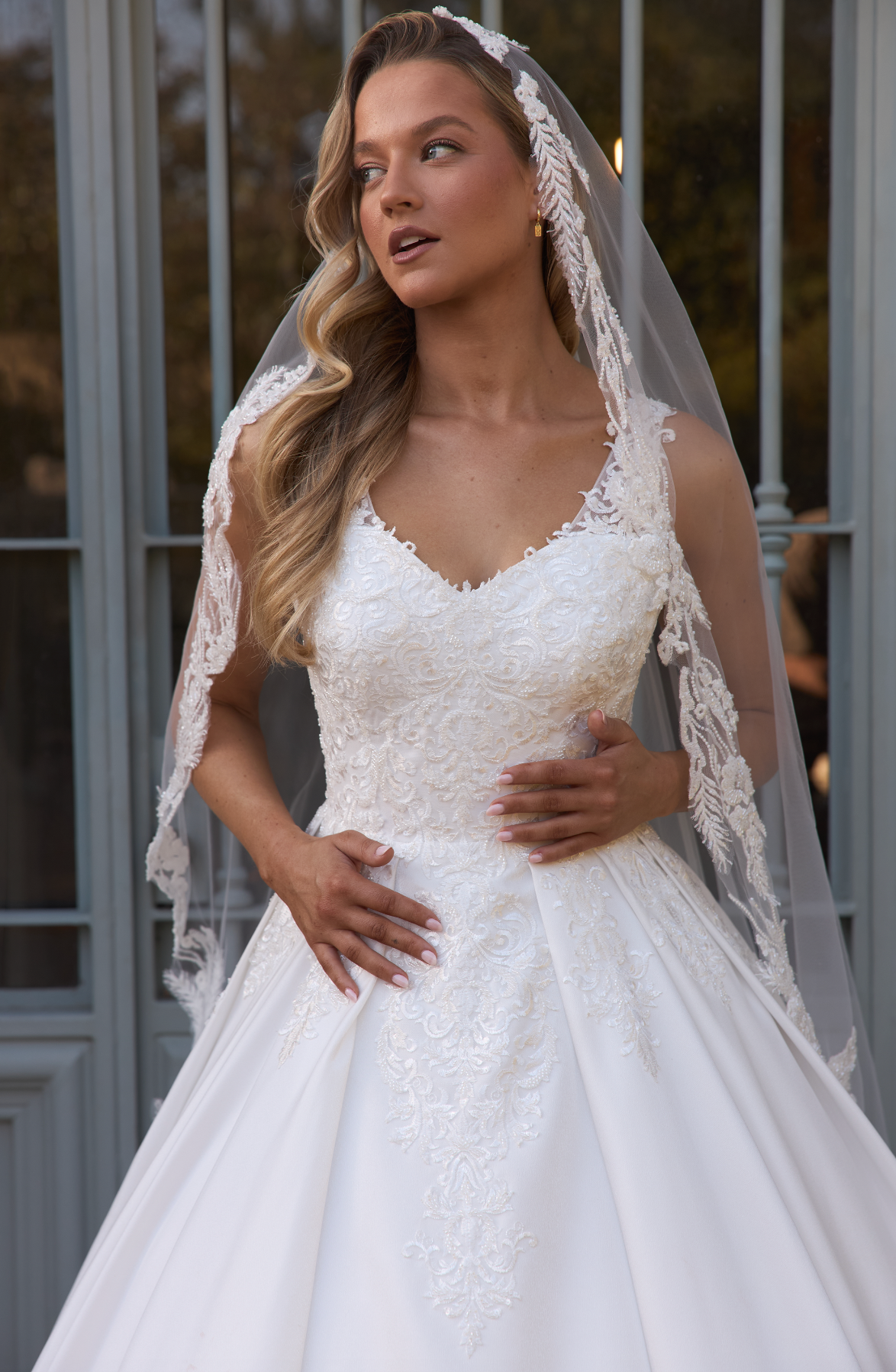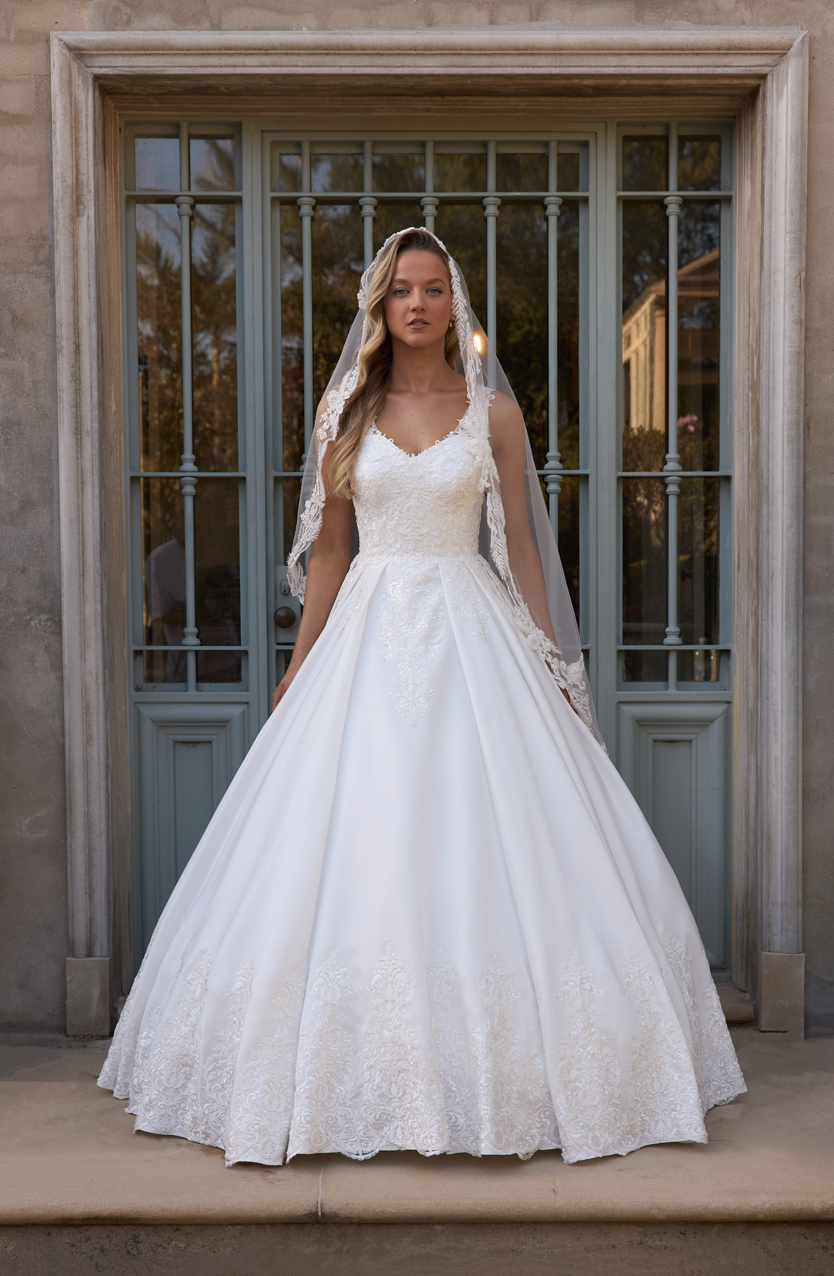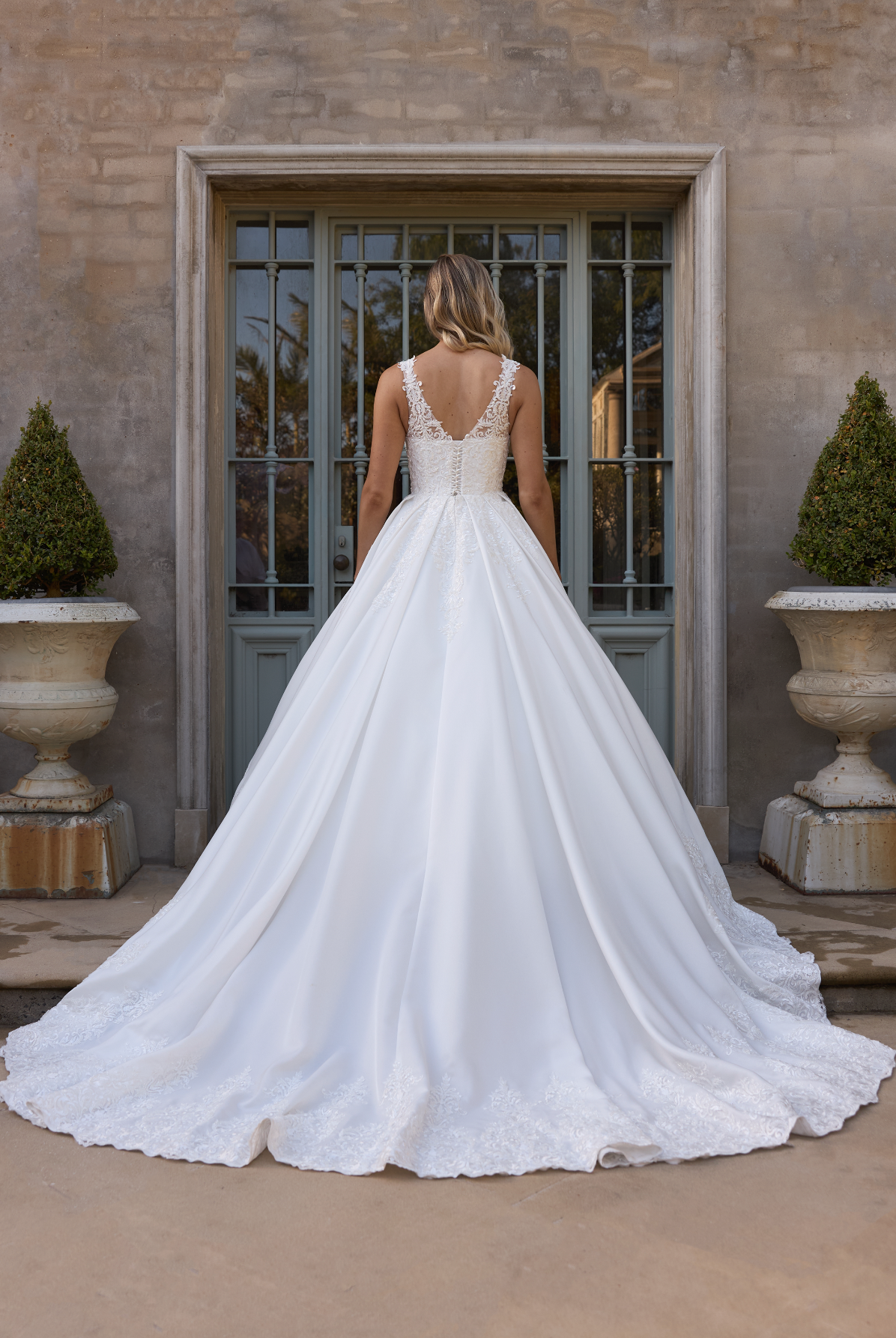 Indulge in elegance with Ipek, a modern ballgown featuring lace details, a shiny satin fabric, and a beautiful embellishment. The thin sheer straps add a touch of elegance while the zipper and tie back provide a secure fit. Complete the look with a long train for a truly stunning ensemble.
